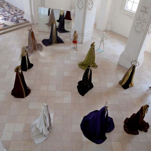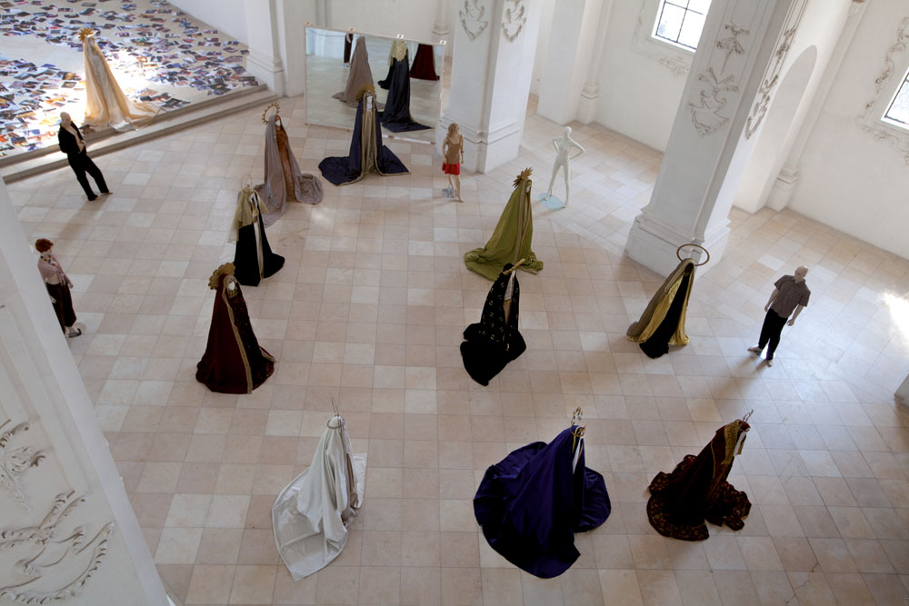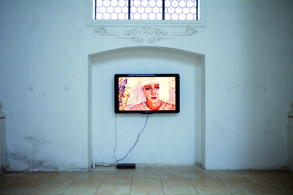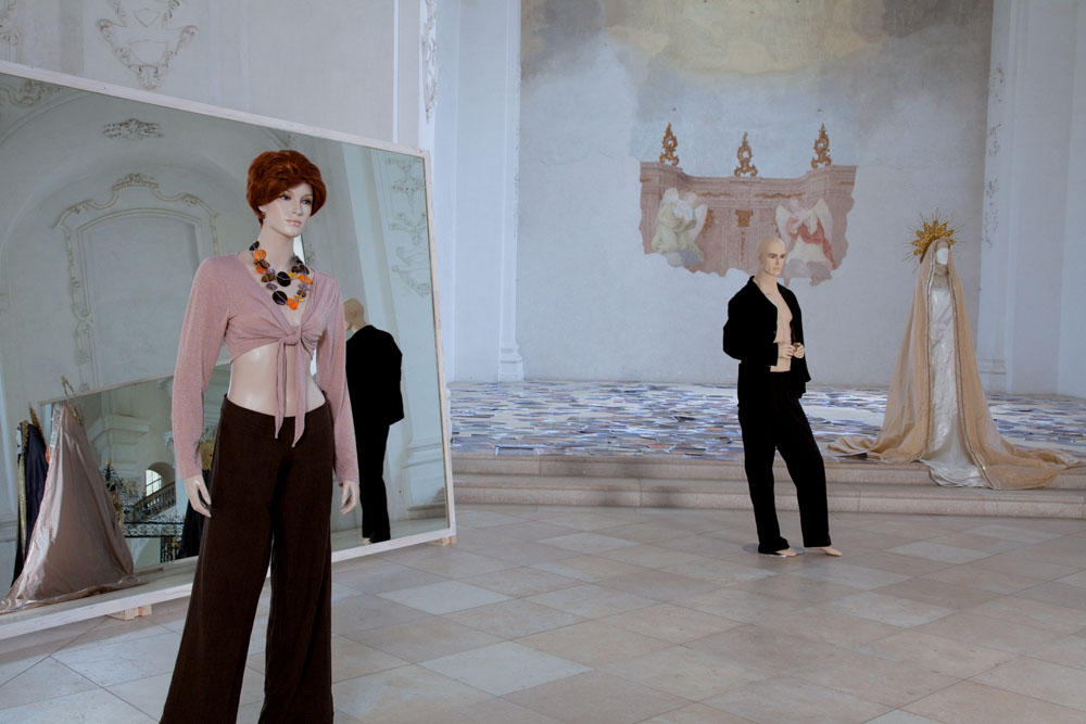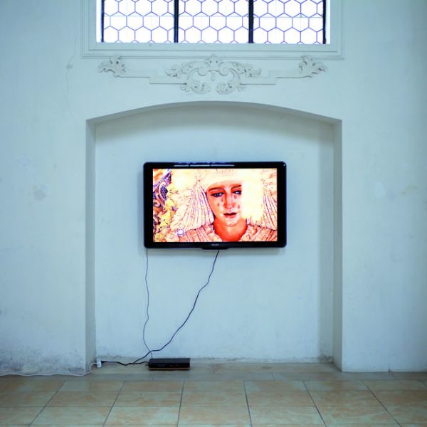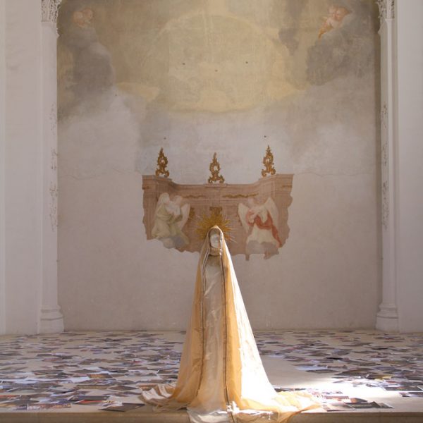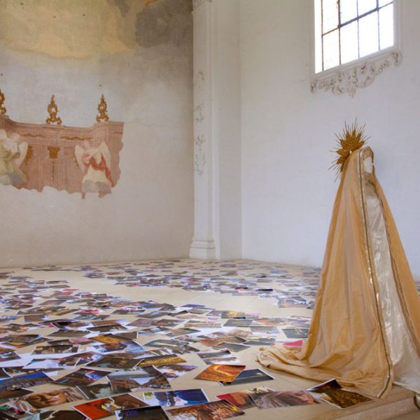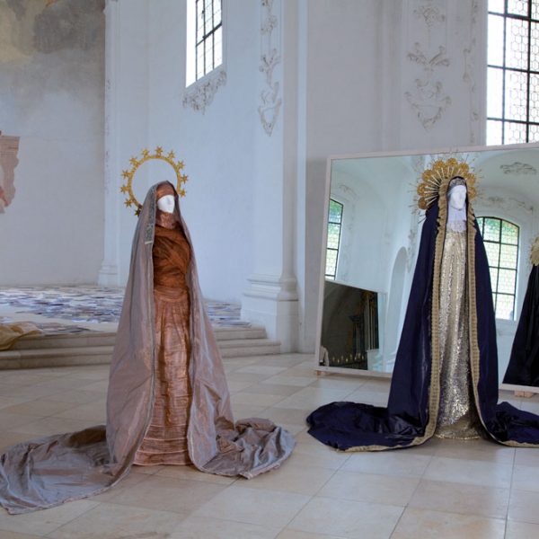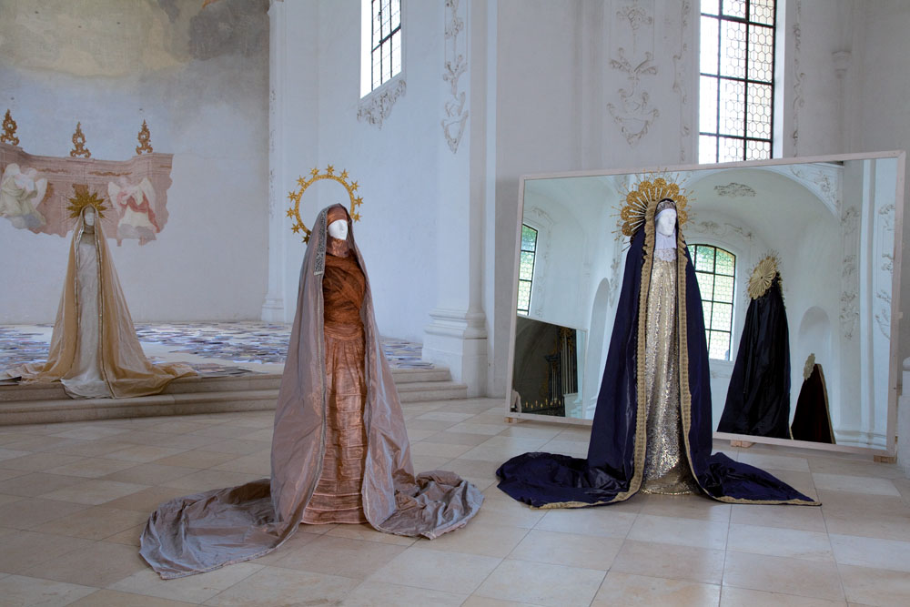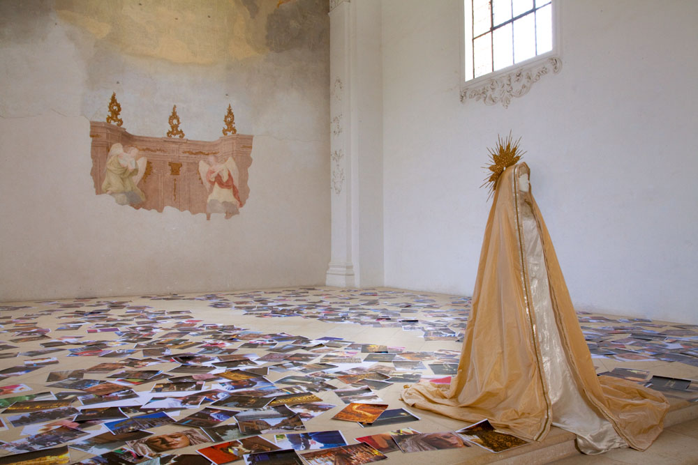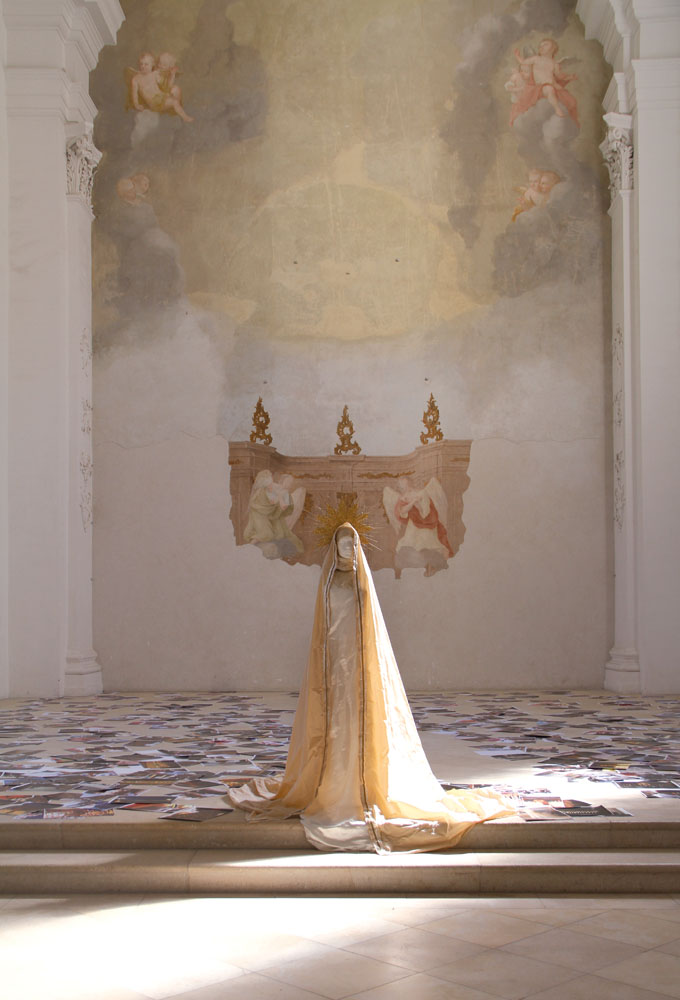 L’artiste propose un véritable parcours dans l’abbatiale et convie le visiteur à une procession étrangement envoûtante. Après une suite d’étapes rythmées par des vidéos, des photographies et des installations sonores, le visiteur accède au chœur de l’abbatiale où est disposé un ensemble de Vierges aux robes et aux couronnes richement décorées, conçues spécialement pour cette occasion avec l’aide de costumières: Janick Nardin, Le Locle, et Marie Delphin, Théâtre des 13 vents, Montpellier.